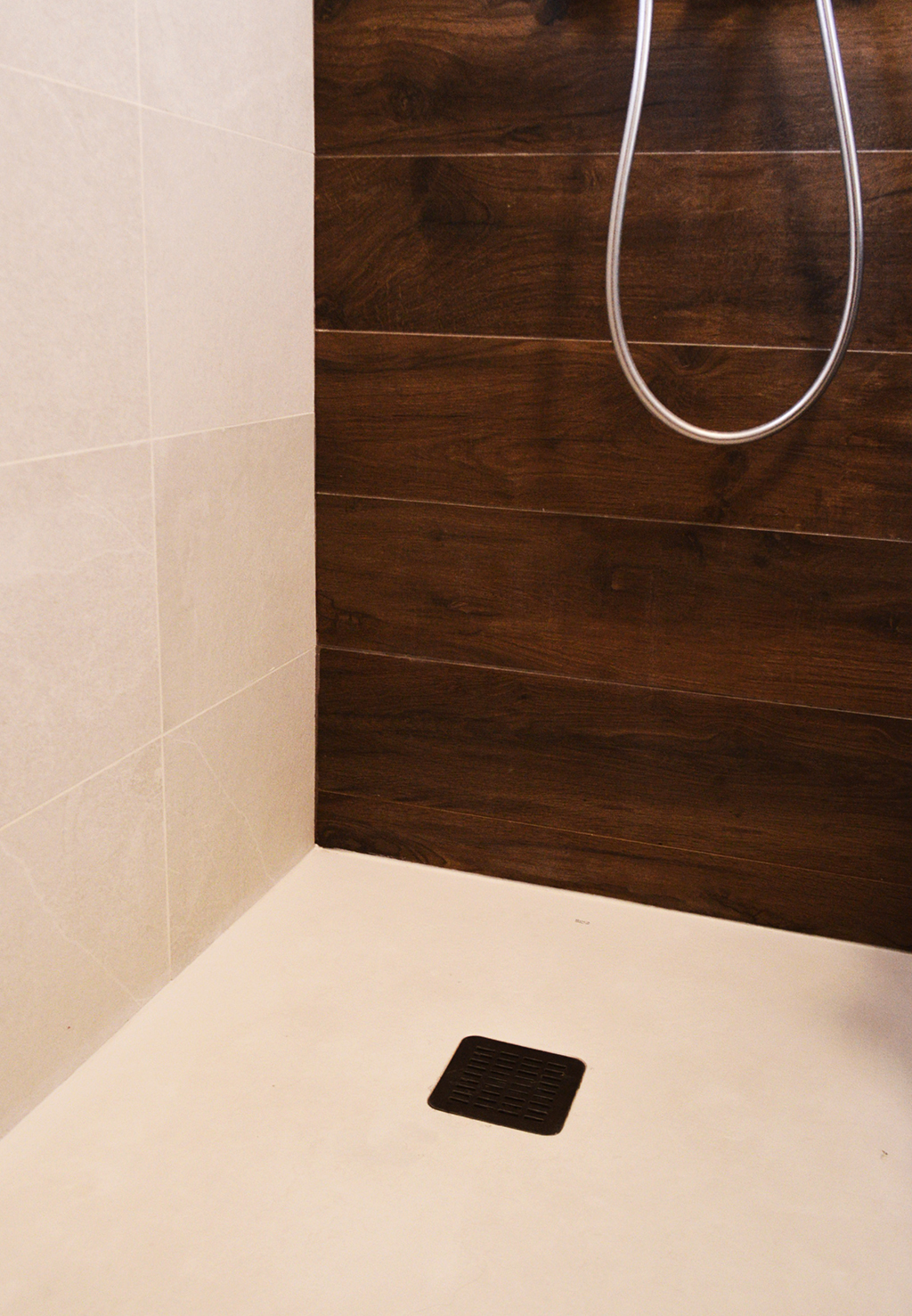 Concernant la salle de bain, la baignoire a été remplacée par une douche sans élévation du sol. Le bois et la pierre se marient à la perfection dans ce nouvel espace, maintenant plus moderne.