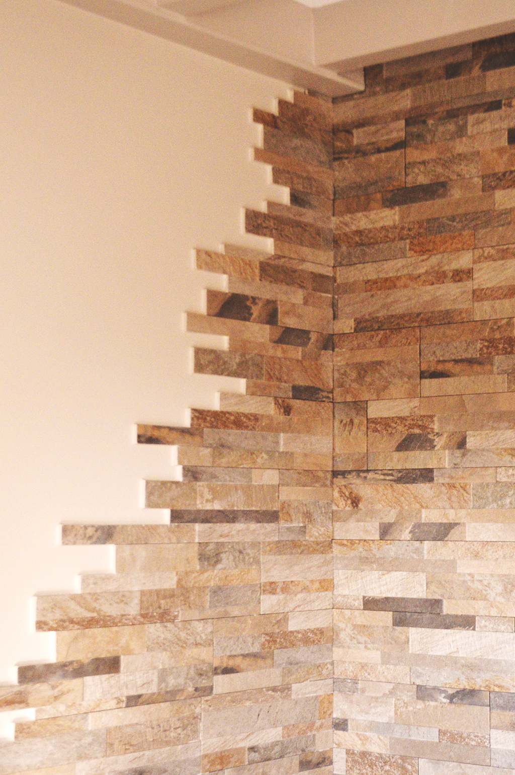 Pour ajouter dynamisme et convivialité au séjour, le sol existant a été remplacé par un nouveau carrelage multi-format en dalle de château, et un nouveau parement pierre a été posé derrière le poêle à bois.