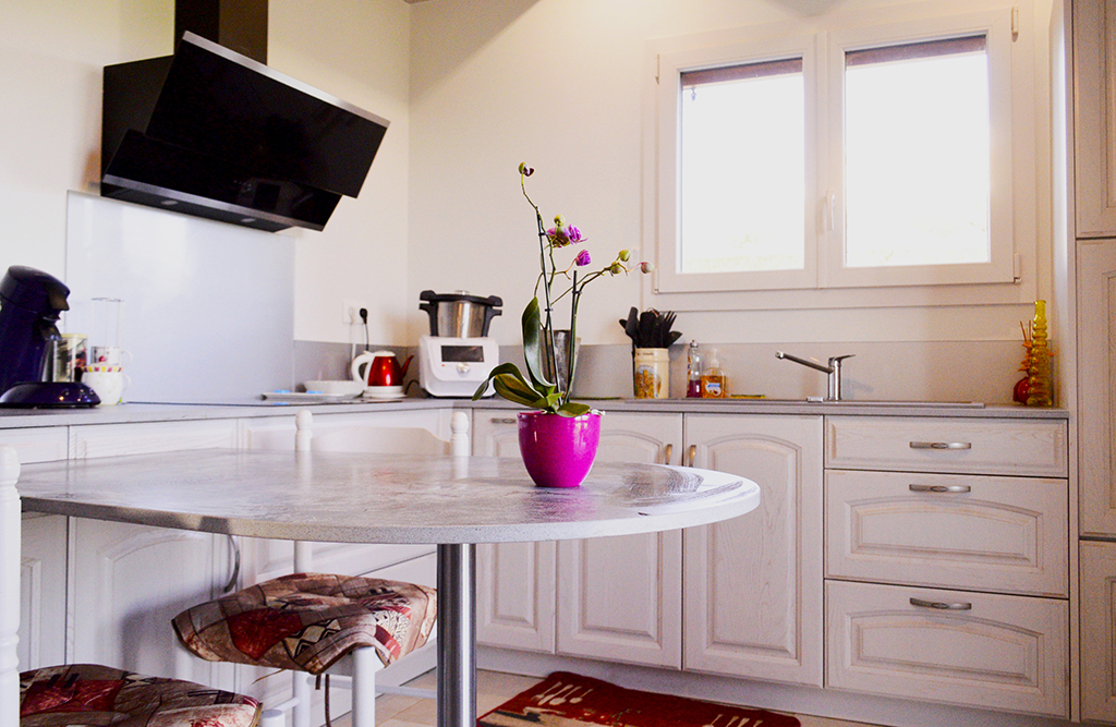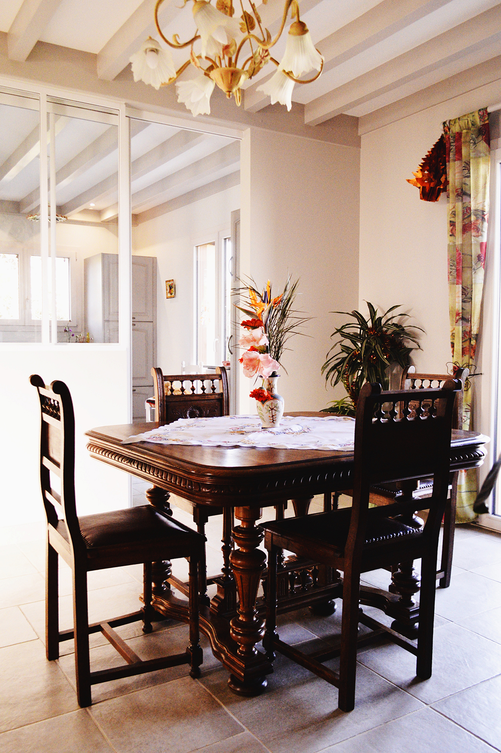 Après avoir écouté les réels besoins de notre cliente, nous avons choisi de séparer la cuisine par une verrière, qui selon le besoin, laisse ouvert ou fermé cet espace. Ce choix permet aussi un gain de lumière naturelle essentielle à la pièce de vie.