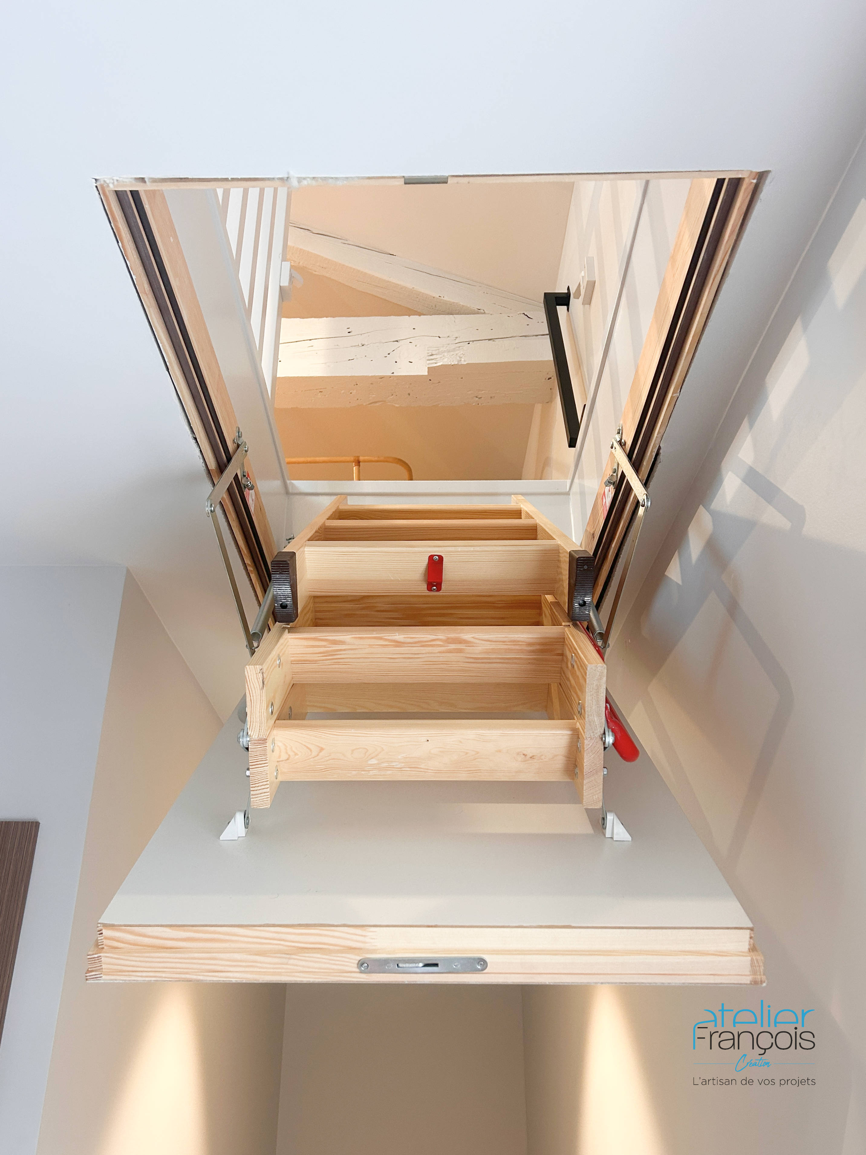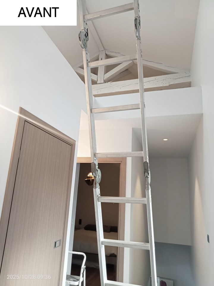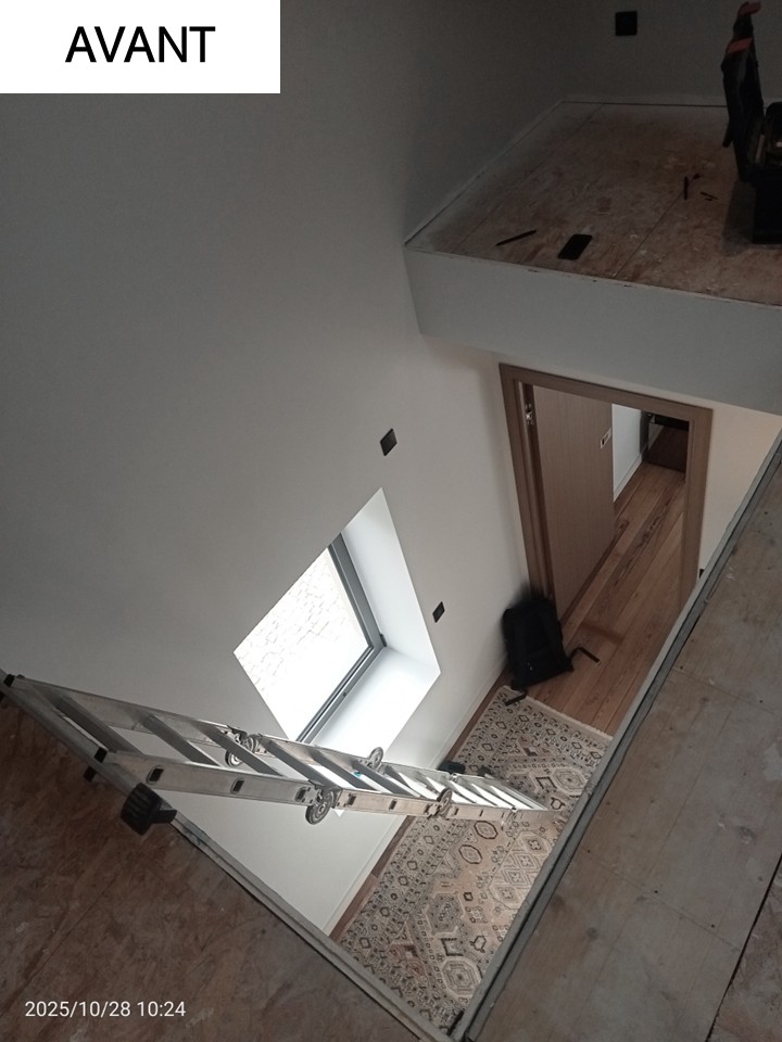 ✔️ Création d’un accès à la mezzanine avec ouverture de trémie, pensée pour s’intégrer parfaitement à la configuration existante et permettre un accès confortable malgré les contraintes d’espace.
